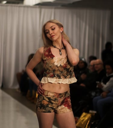 Two piece set made from upcycled tablecloth and curtain ruffles. Top and micro shorts inspired by 60s/70s fashion. Sustainably made.